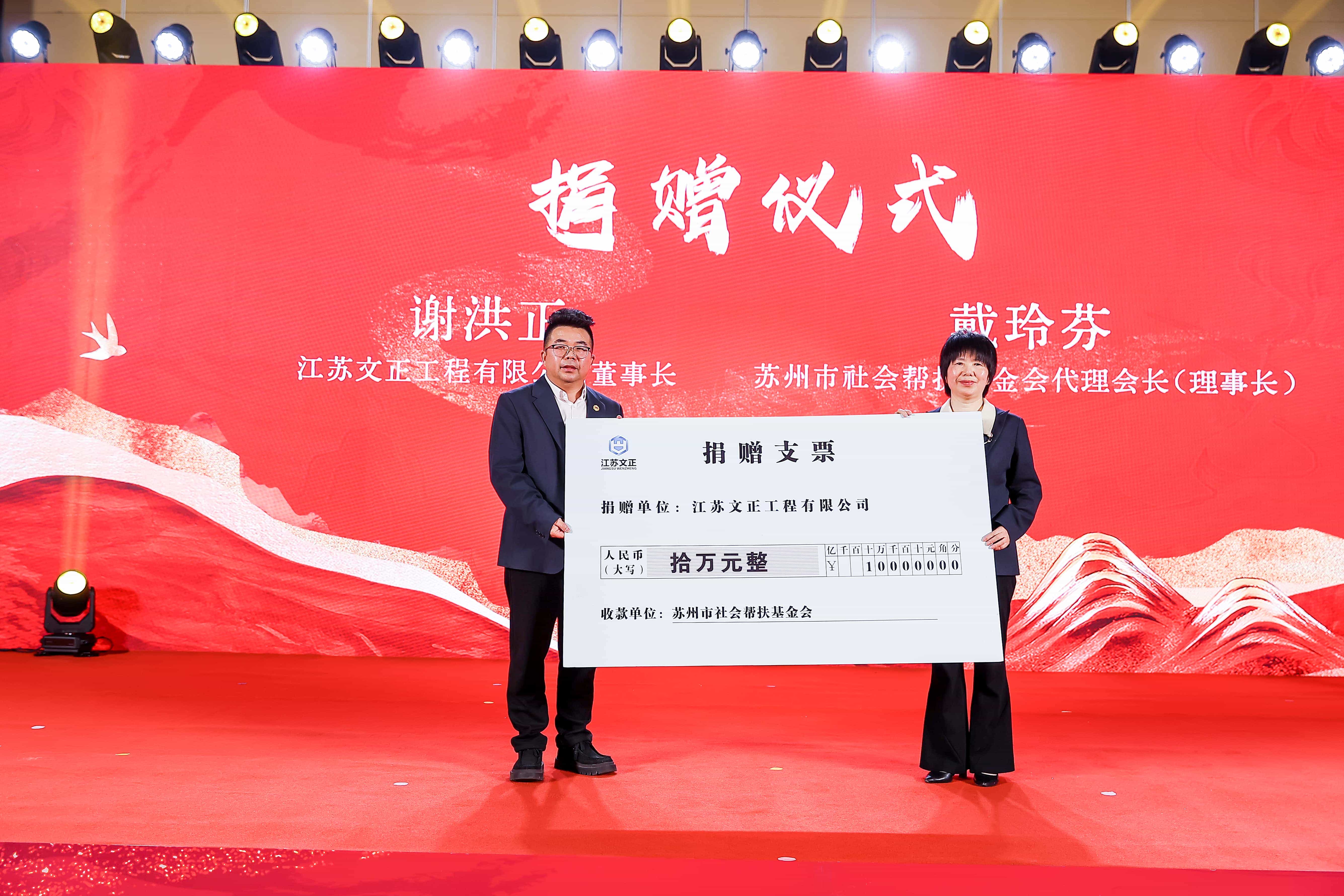 更令人动容的是,董事长谢洪正代表全体文正人现场向苏州市社会帮扶基金会捐款 10 万元,以实际行动践行企业社会责任。苏州市老区开发促进会、乡村振兴促进会、社会帮扶基金会代理会长戴玲芬上台表达诚挚感谢,这一善举不仅温暖了受助者,也让文正的品牌闪耀着人性的光辉,彰显企业担当。