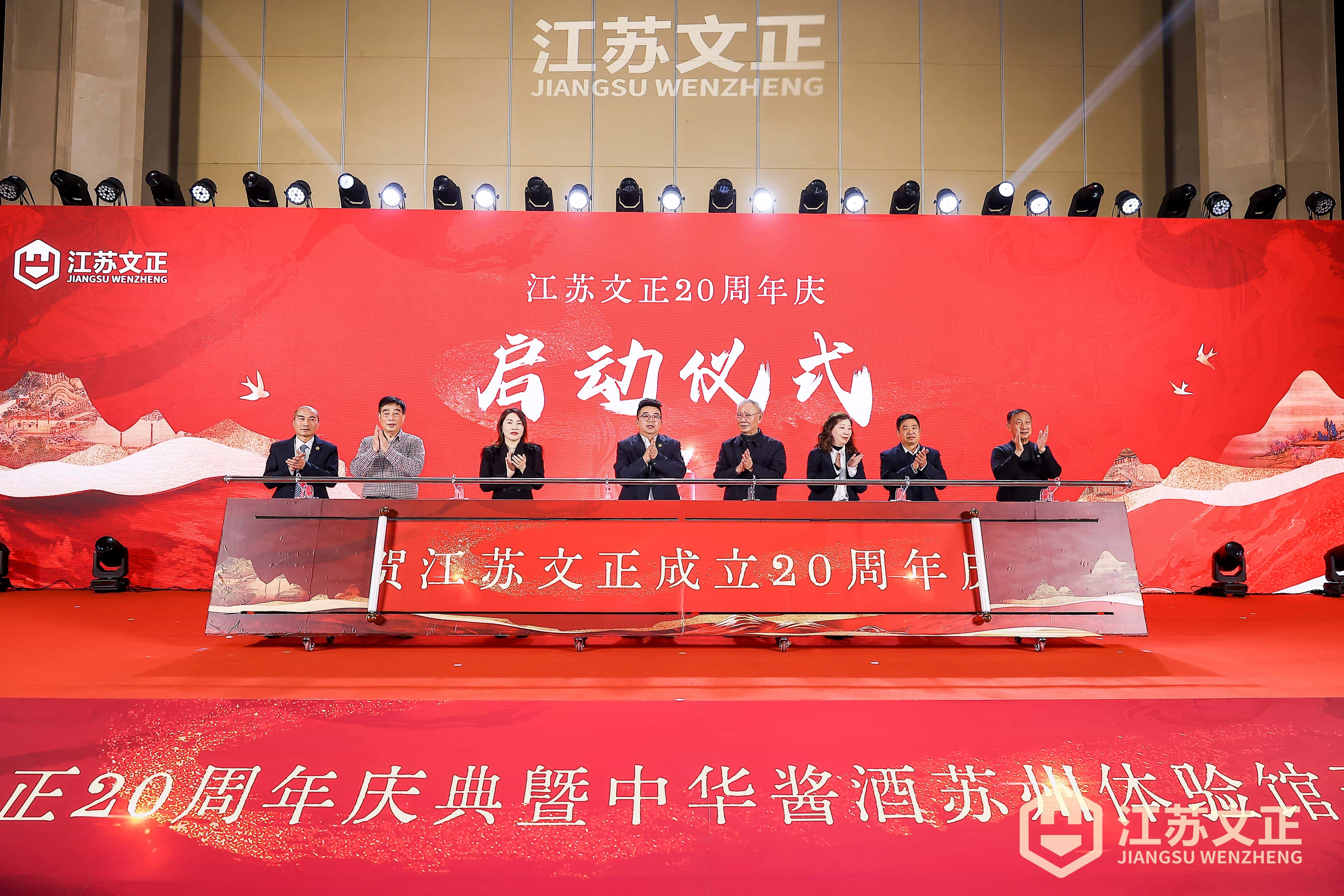 随后,祝贺文正成立 20 周年庆典卷轴启动仪式正式开始。中国安装协会原监事长邹金林,苏州建设局建管处原处长祝建国,苏州一建安装公司原经理张冠忠及我司领导班子成员共同上台推杆,当卷轴缓缓展开,仿佛展开的是一幅写满文正故事的长卷,二十年的岁月浓缩其中,见证着从初创的艰辛到如今的辉煌,这一刻,所有文正人的自豪之情溢于言表。