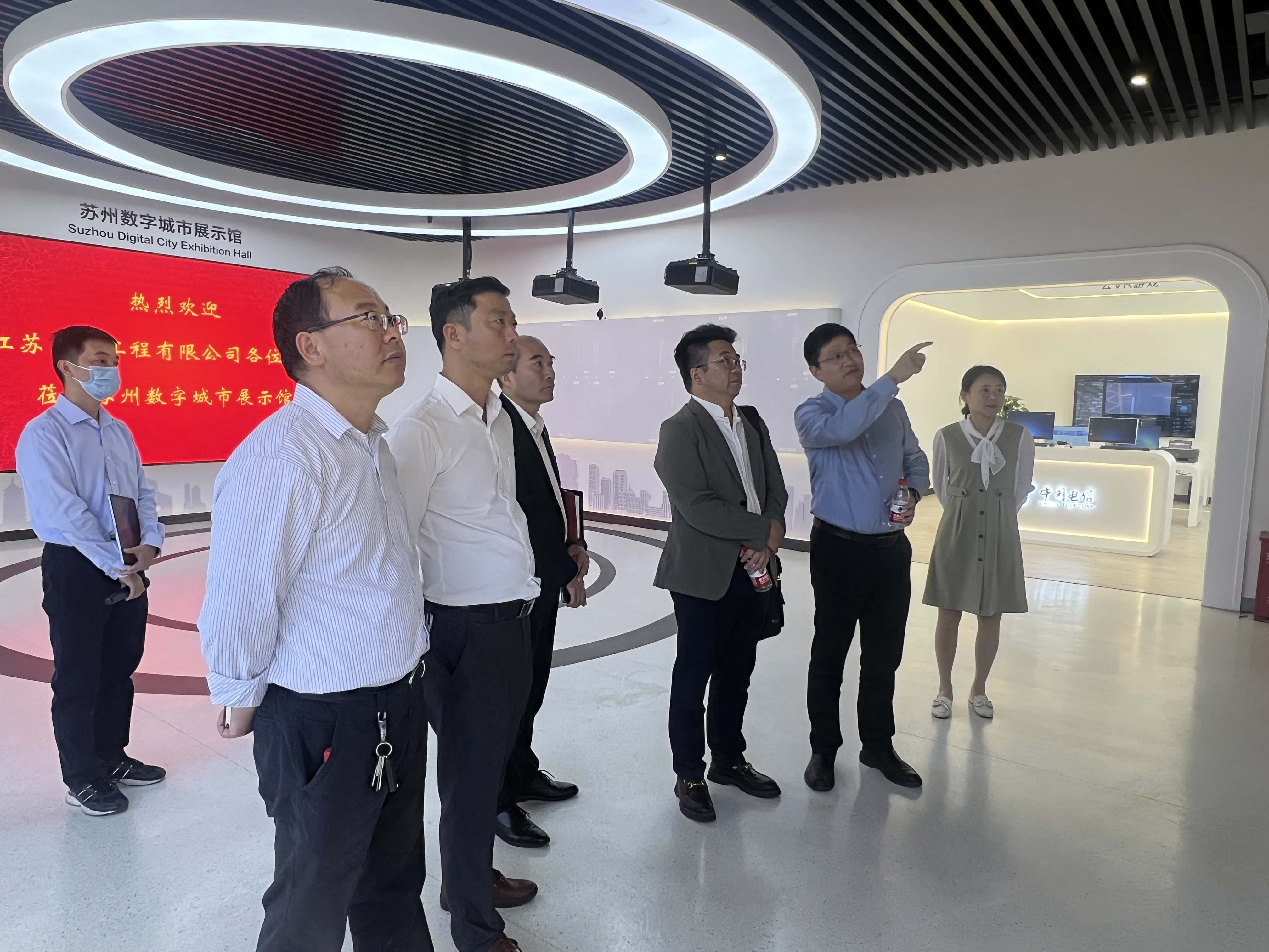 董事长谢洪正一行首先参观了苏州数字城市展示馆,近距离感受苏州电信在智慧社区、云网安全、城市物联感知、工业互联网等方面的核心布局和数字应用,并对云办公、大数据、云计算、区块链以及信创技术等进行询问了解。